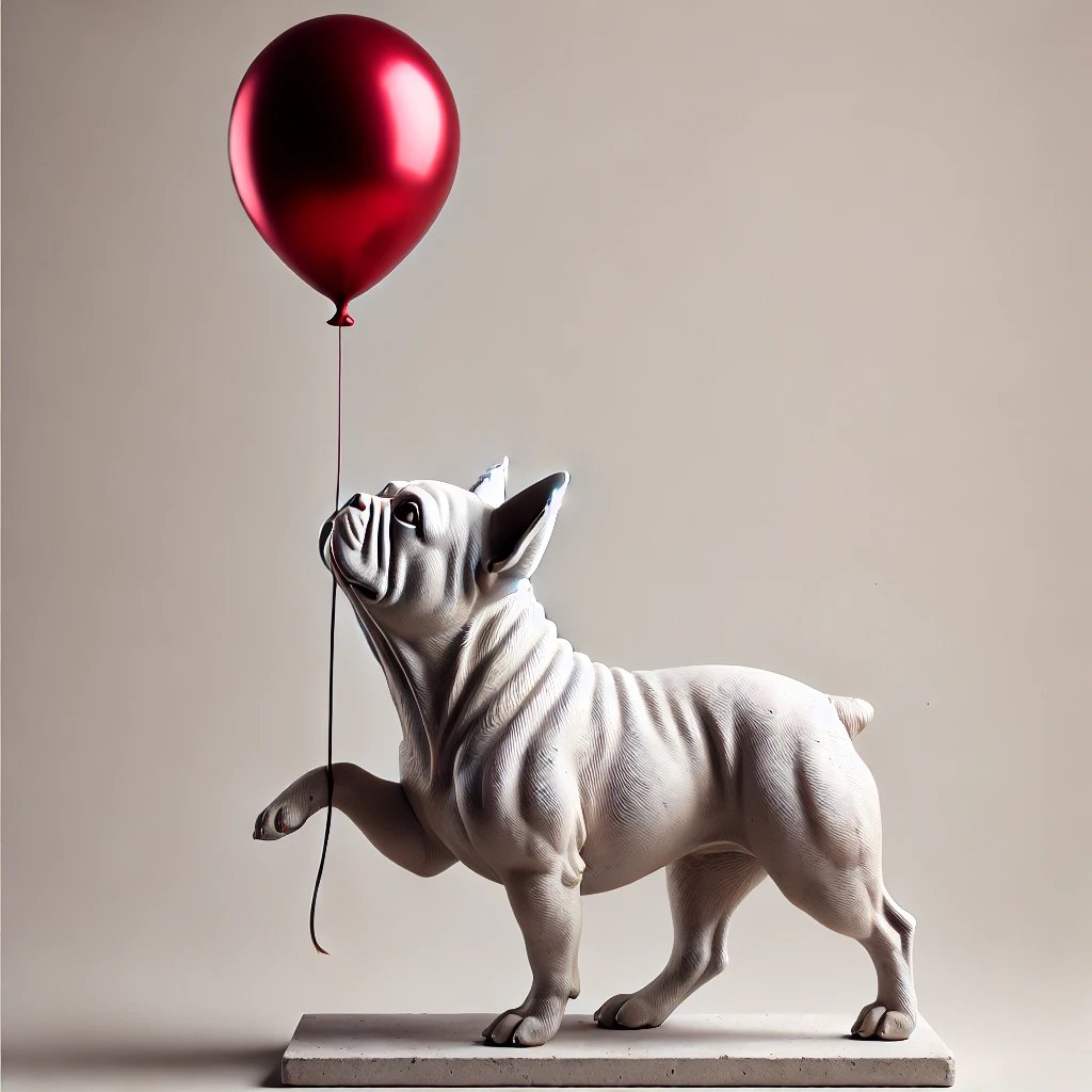 "Meet 'Max,' the first sculpture in 'The Red Balloon Collection.' Max is a dreamy and optimistic French Bulldog, proudly holding a red balloon that evokes feelings of joy and nostalgia. His modern and sleek design features clean lines, combining a luxurious metallic finish with the striking addition of a red balloon. Perfect for anyone looking to elevate their home decor with a charming and unique piece."